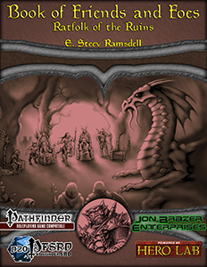 Fully fleshed-out hirlings and arch-nemeses for your characters await within! The Book of Friends and Foes: Ratfolk of the Ruins delivers seven NPCs to expand your Pathfinder Roleplaying Game. These ratfolk will keep your characters guessing who to trust and what deadly danger lurks around the corner. Covering CR 1/2-8, these NPCs will steal your evil Game Master’s heart along with the player’s gold pouches. Use these friends and foes to hang plot hooks and move your adventure along.