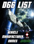 Last but not least, we bring you d66 Vehicle Manufacturer Names. This d66 list delivers 36 names for vehicle manufacturers. Whether you are looking for a massive, multi-planetary corporation that produces gravcars and much more or a small local specialty company that hand makes flyers and ground cars, this list is here to help. Download at the JBE Shop.