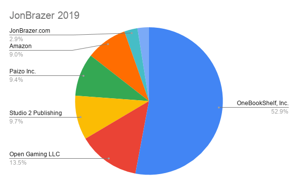 In both pie charts, DriveThruRPG comes out on top and is approximately 50% of the market. Both Paizo and Amazon held on, each having about 8-9% of our sales.