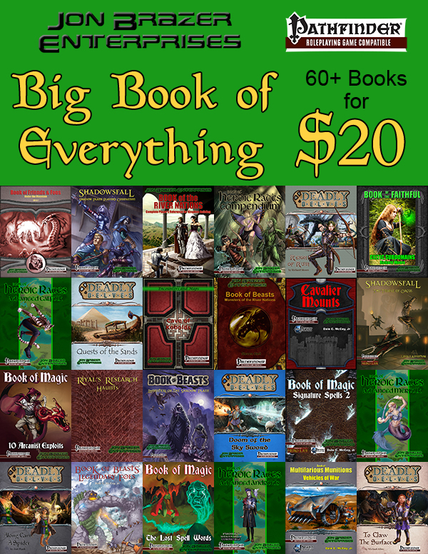 March to an Amazing Sale Jon Brazer Enterprises is offering for the month of March everything we produces for Pathfinder from our first book all the way to the end of 2016 for the crazy price of only $20. That is over 90% off the regular price. This includes some of the highest rated monsterContinue reading “Pathfinder: JBE’s Big Book of Everything”