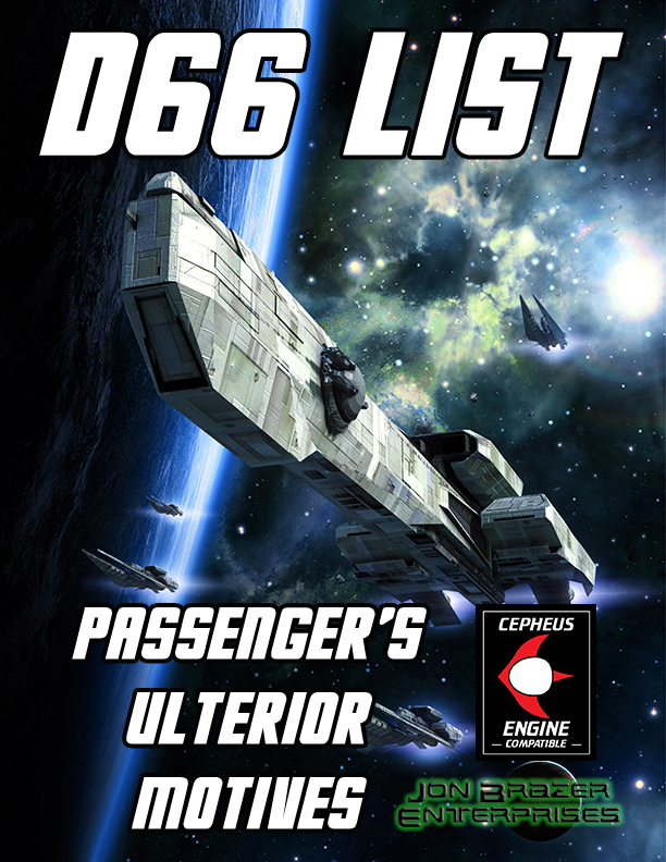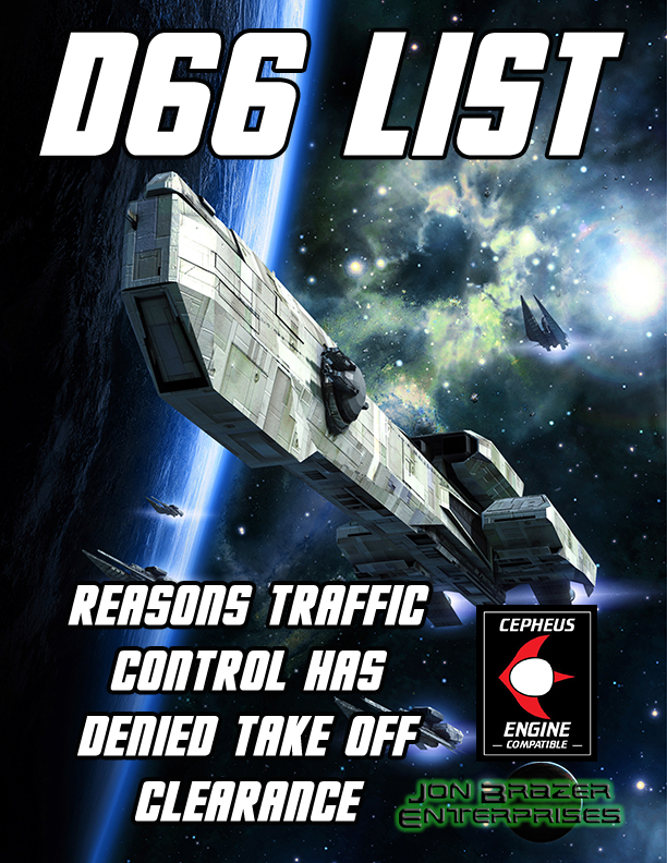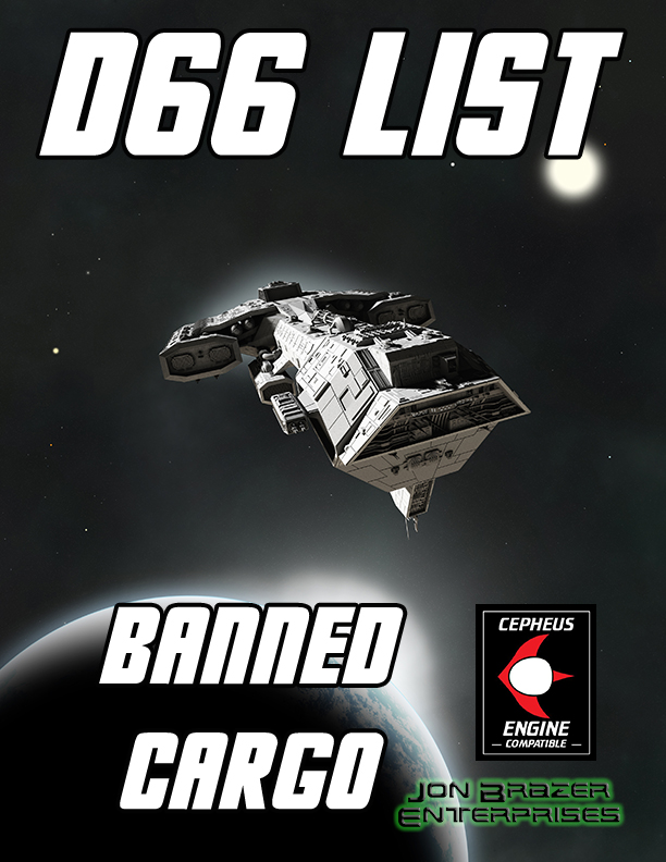 JBE just released four new d66 lists, available now on DriveThruRPG. Every planet has some unusual cargo that they forbid from being imported. d66 Banned Cargo gives you that exact answer right when you need it. Every group of flyers has a nickname to distinguish themselves from the rest. Have the perfect name ready withContinue reading “Traveller: 4 New d66 Lists”